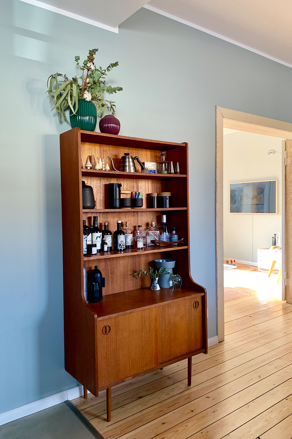 Im geschlossenen Teil des Highboards finden Tabletts, Schneidebretter und der Entsafter Platz, während im offenen Regal einige Kaffeeutelsilien und ein Teil unserer Gin Sammlung gepaart mit etwas Deko zu finden sind.