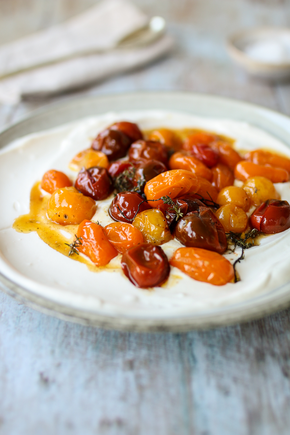 Rezept für geröstete, heiße Kirschtomaten auf kaltem Joghurt – falls der Sommer noch mal vorbei kommt!